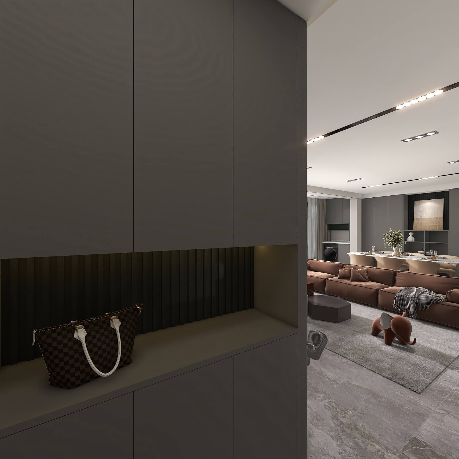 大面积运用深灰色,格栅元素极具设计感,在层板灯的渲染下整个玄关轻奢有内涵,给空间增添了几分自然纯粹的气息,让人身心放松。